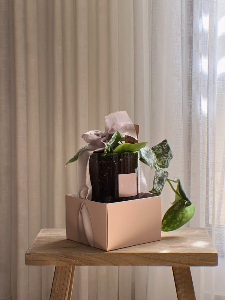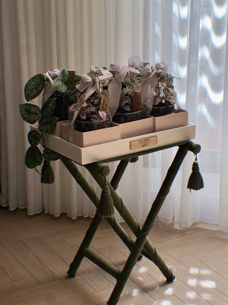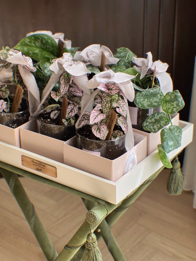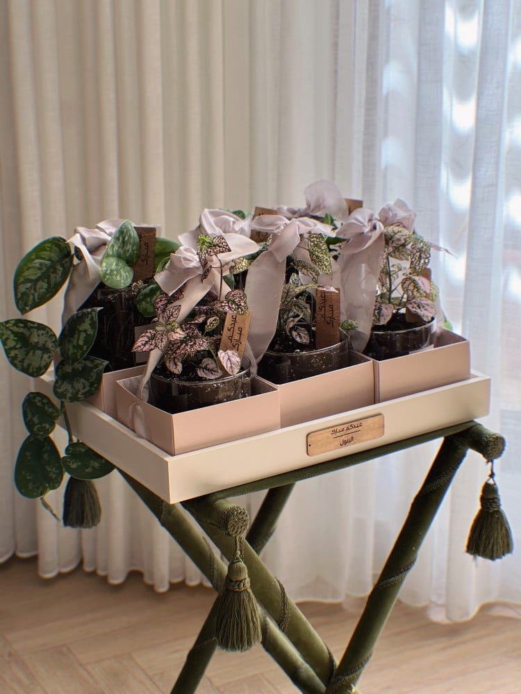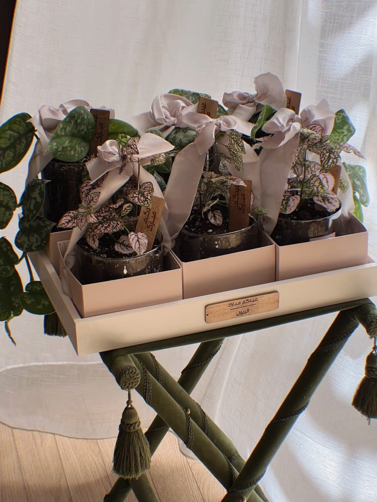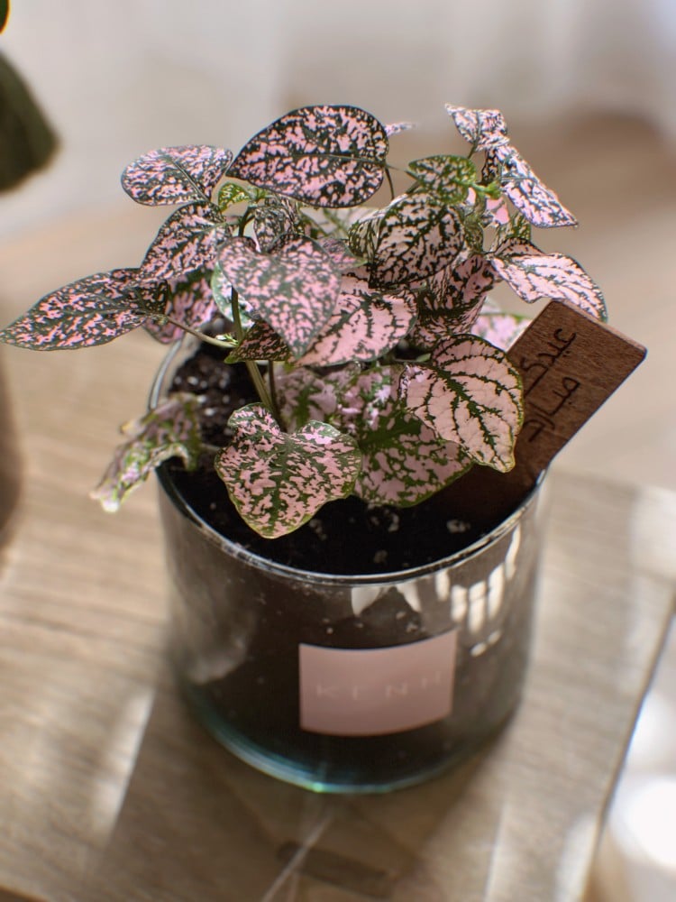 عيدية فريدة مكونة من مجموعة نباتات قوية و مميزة بالوان مرقطة منسقة و مجهزة في اصيص زجاجي بتربة عالية الجودة .