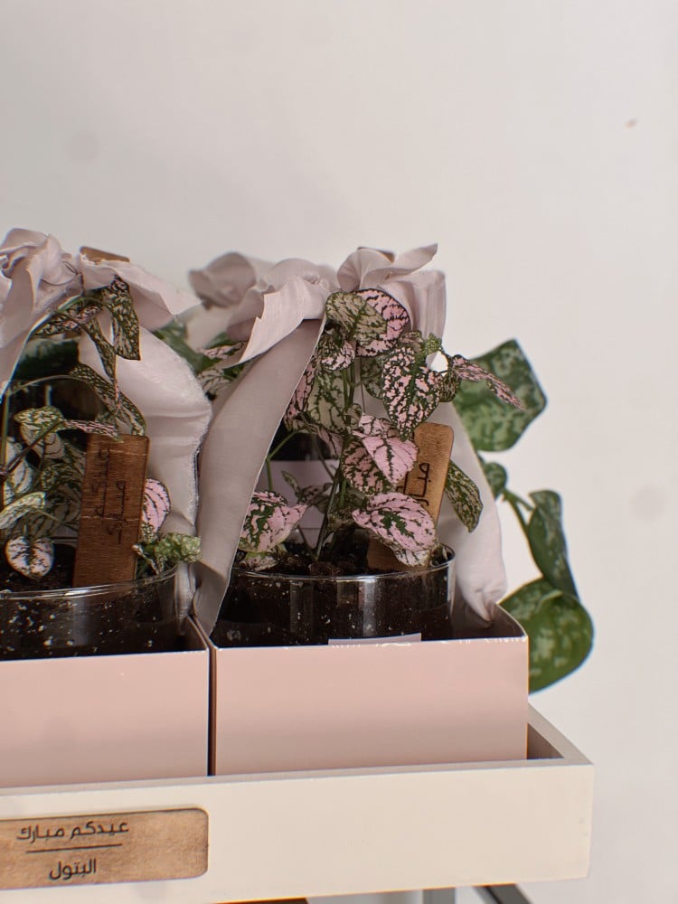 - ٣ نباتات هيبوستس وردي منسقة في اصيص زجاجي صندوق حامل .