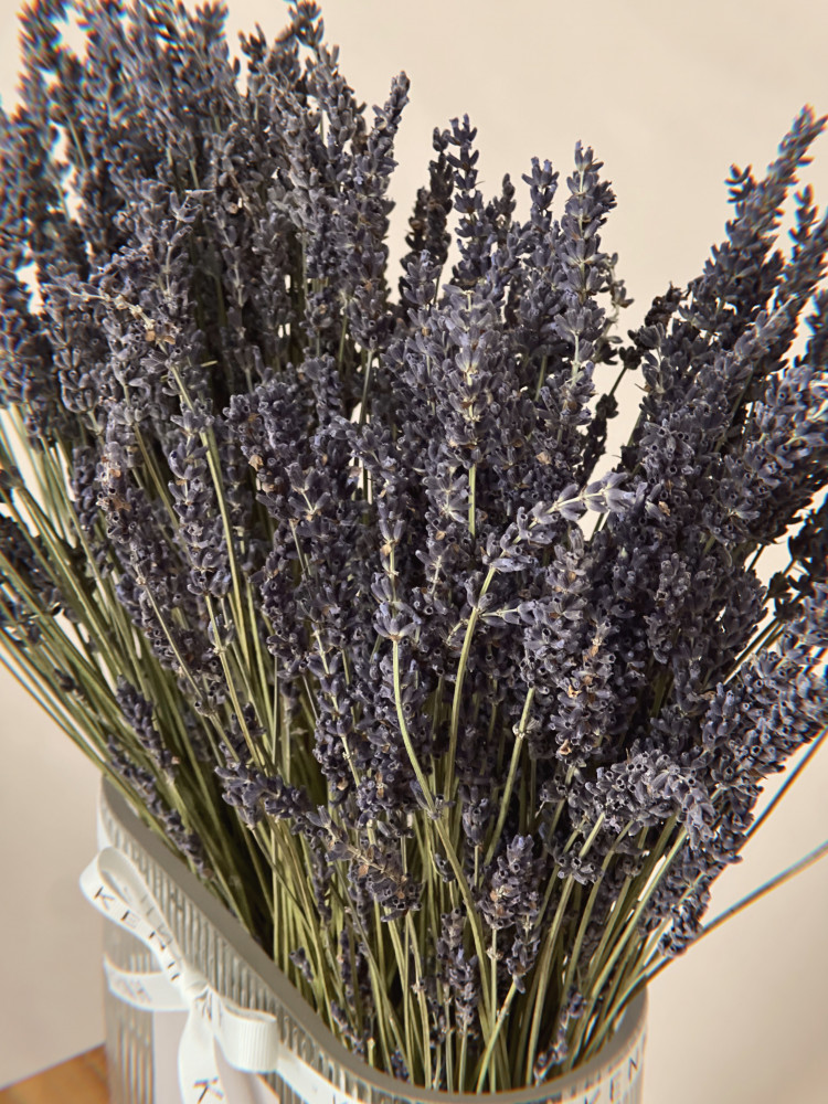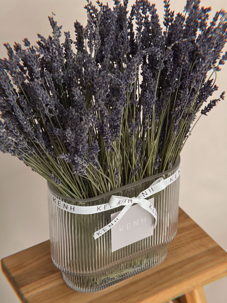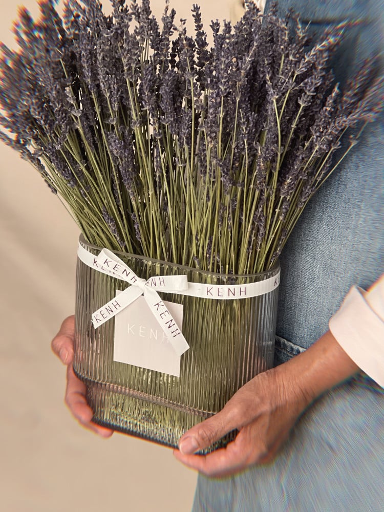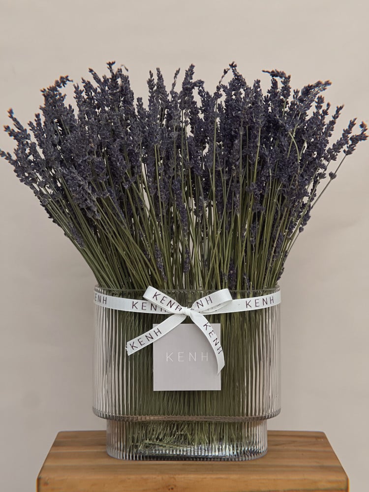 فازة زجاجية منسقة بزهور الافندر الهولندي الطبيعي .