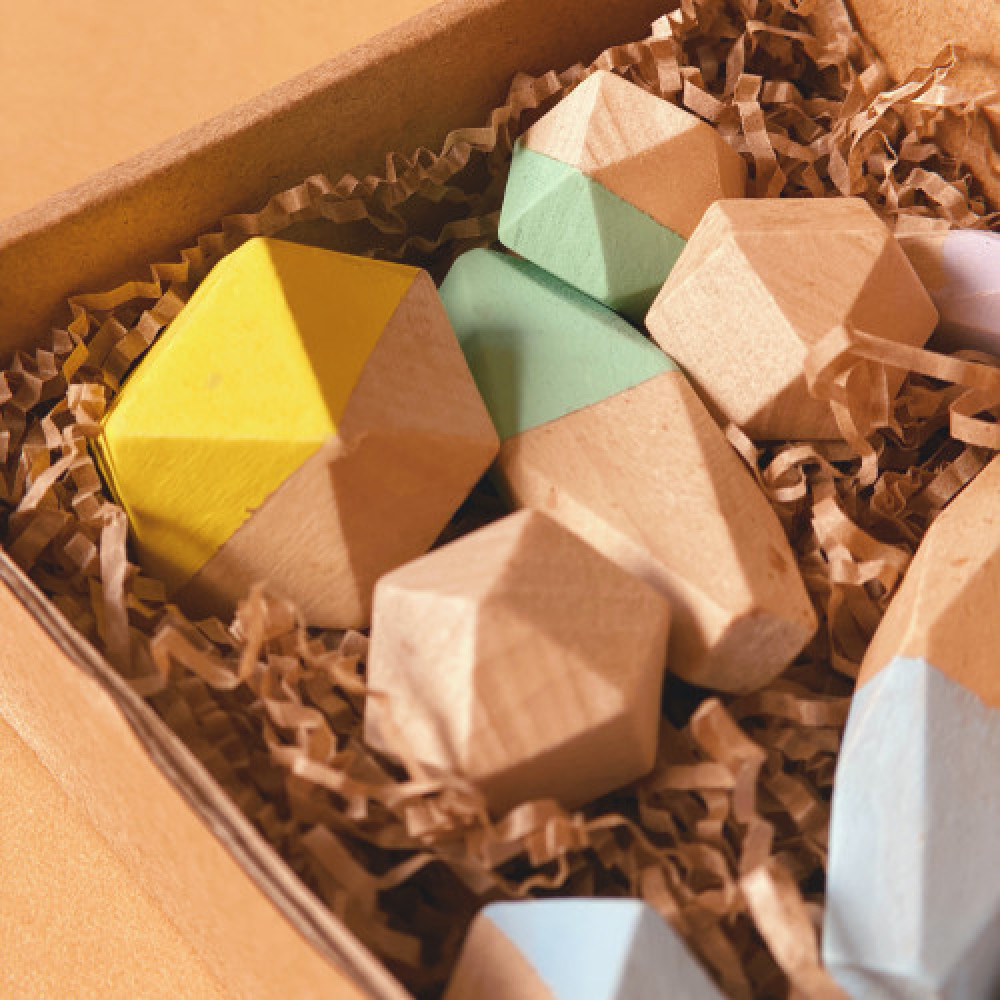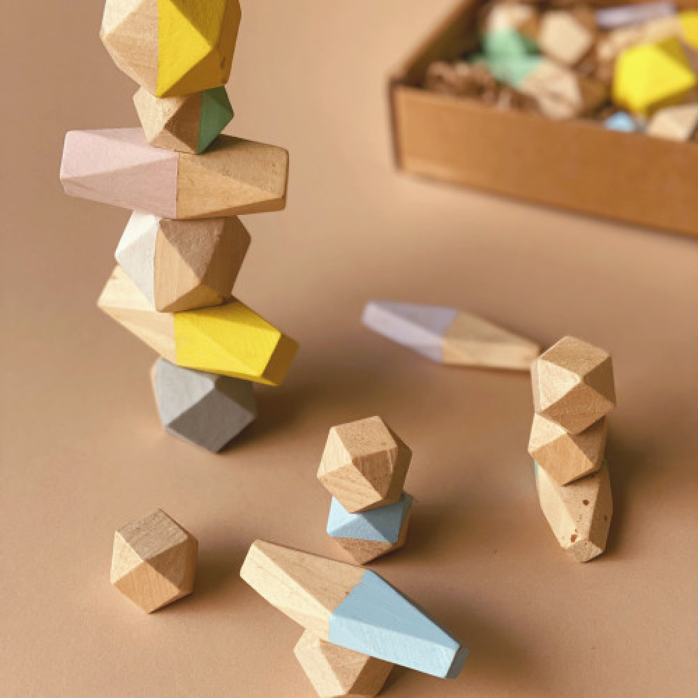 اللعبة تحتوي على مجموعة من القطع الخشبية المصممة بأحجام و بزوايا مختلفة ليتمكن الطفل من بناء القطع فوق بعضها بمهارة التوازن .