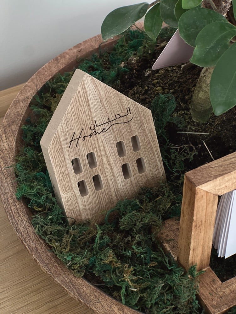 مع تخصيصها باسم اصحاب المنزل على قطعة خشبية بشكل بيت