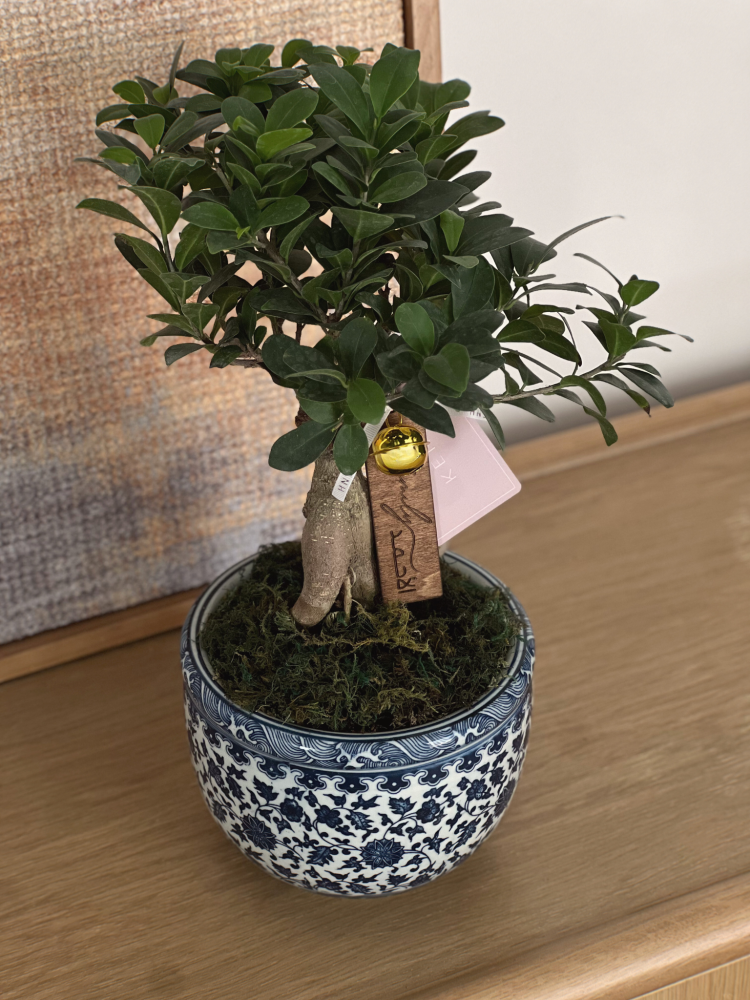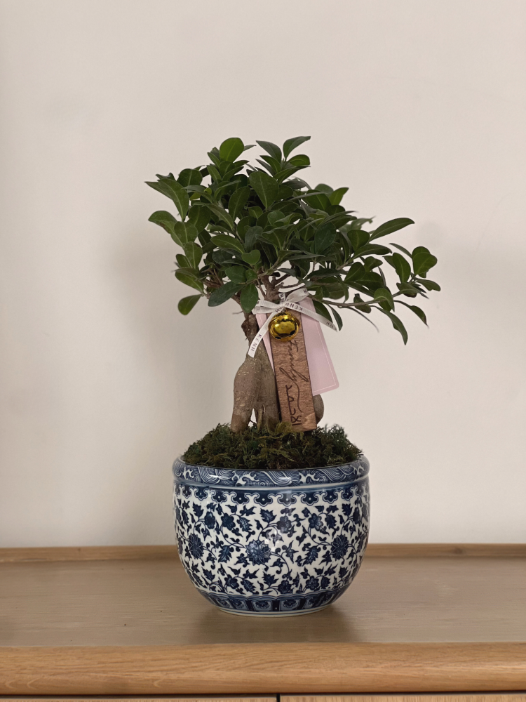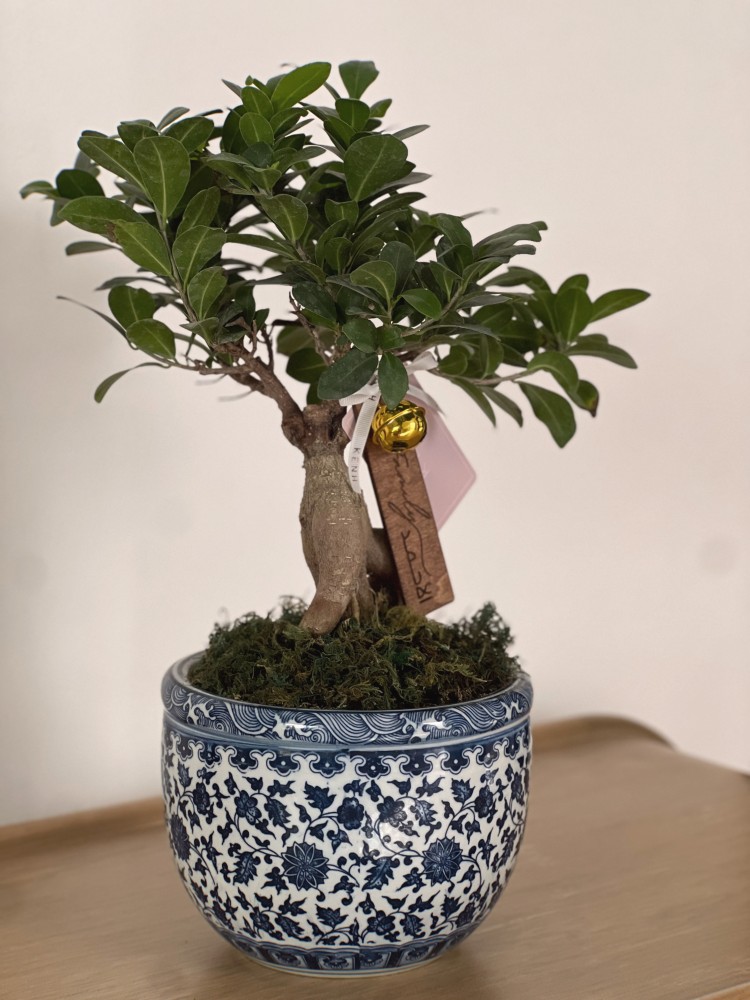 هدية شجرة البونساي المعمرة منسقة في أصيص زراعي بنقوش زرقاء